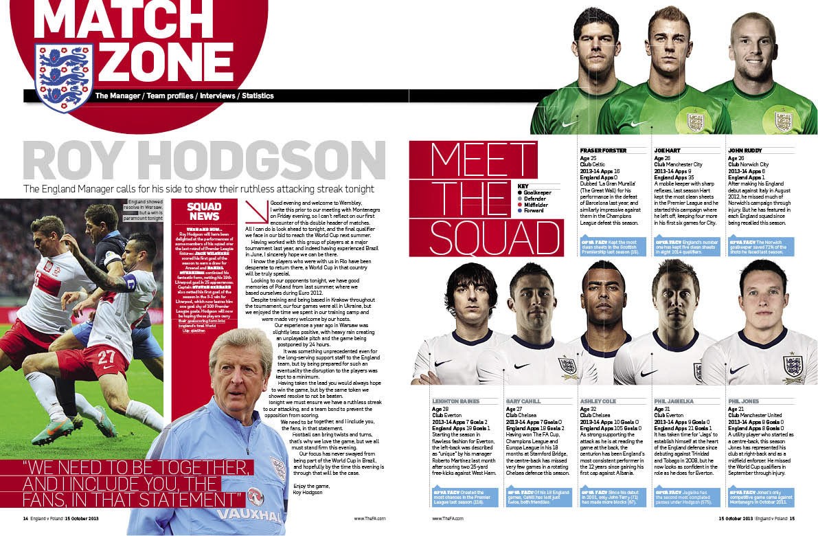 Role: contributing art editor and designer to England matchday and domestic tournament final programmes, with Sharon O'Connor, and Mike Wescombe. Client: Nick Judd, Haymarket Media Group.